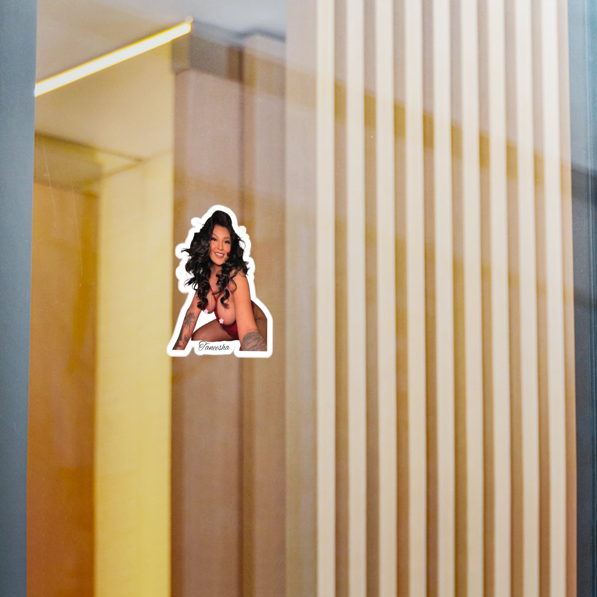 This premium kiss-cut sticker features Taneesha in her iconic Red Velvet look — soft curls, deep red lingerie, and a warm glam glow. Printed on durable vinyl with a crisp white outline and her signature beneath the pose. Perfect for laptops, water bottles, journals, or collector display.